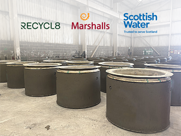 Recycl8 joined forces with partners Marshalls for a manufacturing trial of precast manhole rings for Scottish Water using their R8 Mix lower carbon concrete.